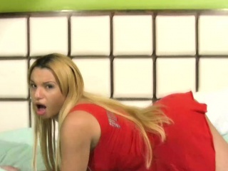 Blonde tranny lubes her huge ass with lotion and jerks off